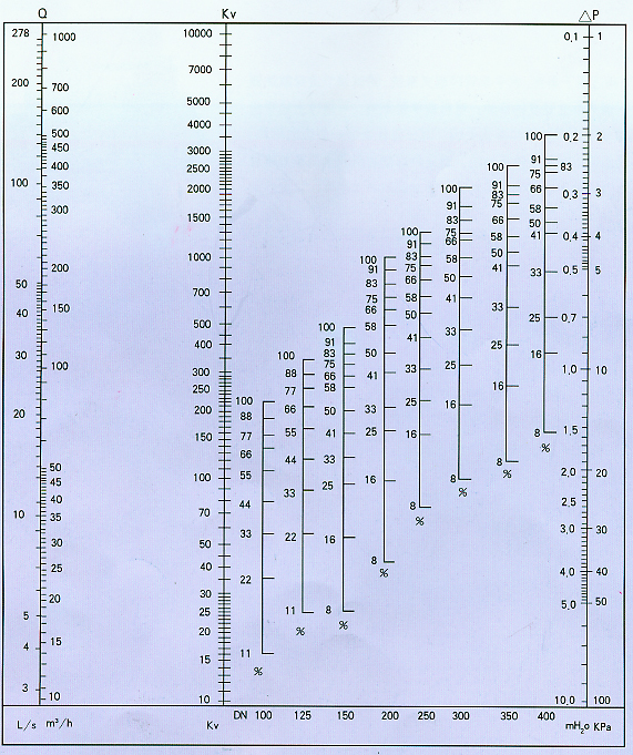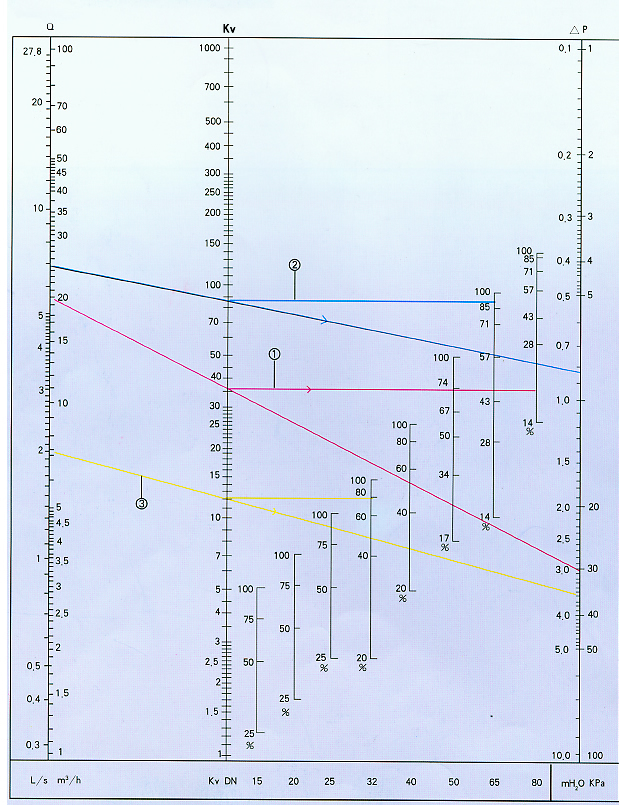 SPF(SP) Series Numerical-Locked Balance ValveThe explanation of the following diagrams According to the formula: Kv=Q/ Example 1 : When the flow Q and △P are known, that is Q=20m 3 /h, △P=30kpa, the diameter and the opening can be obtained by following tthis procedure: Obtain the numerical values on Q-axis and △P-aixs and draw a line between the two numerical values, then the point of intersection between the line and Kv-axis can be obtained. Draw a horizontal line which starts from the point of intersection. The the horizontal line will intersect with the valve opening scales of DN50, DN65, DN80, then the valve opening obtained are 74%, 46%, 20%, that means the balance valve can select any one from among the above-mentioned three diameters (See Diagram 1). Example 2 : when the flow Q and diameter and the valve opening are known, that is Q=25 m 3 /h, DN65, the valve opening is 90%, the pressure differential △P can be obtained as follows: Draw a horizontal line which starts from the point of 90% opening of DN65. The point of intersection between the horizontal line and K v-axis can be obtained. Draw a line between the point of intersection and the point of 25 m 3 /h on Q-axis and extend the line to △P-axis, then △P=8.0kpa can be easily figured out (See Diagram 2). Example 3 : when △P, diameter and the valve opening are known, that is △P=35kpa, DN32, the valve opening 80%, the flow can be obtained as follows: Draw a horizontal line which starts from the point of 80% opening of DN32. The point of intersection between the horizontal line and K v-axis can be obtained. Draw a line between the point of intersection and the point of 35kpa on △P-axis and extend to Q-axis, the flow rate= 7.4 m 3 /h can be obtained (See Diagram 3). |