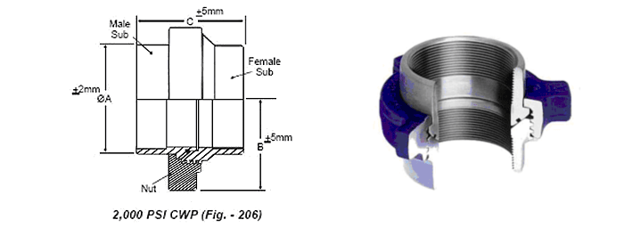 Fig 206.These unions have an additional 'O' ring on the spherical surface of the male sub providing a leak proof seal. All dimensions of fig:- 200 & Fig-206 are identical.