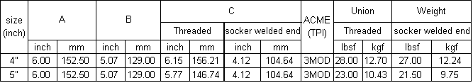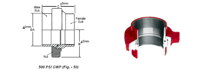 Fig 50.These low pressure and suction union of Fig-50 are made from carbon steel. The nut and O-ring are common in both sizes. Available in 4" or 5" sizes in threaded & socket welded connection. These unions are suitable for 500 PSI wp.